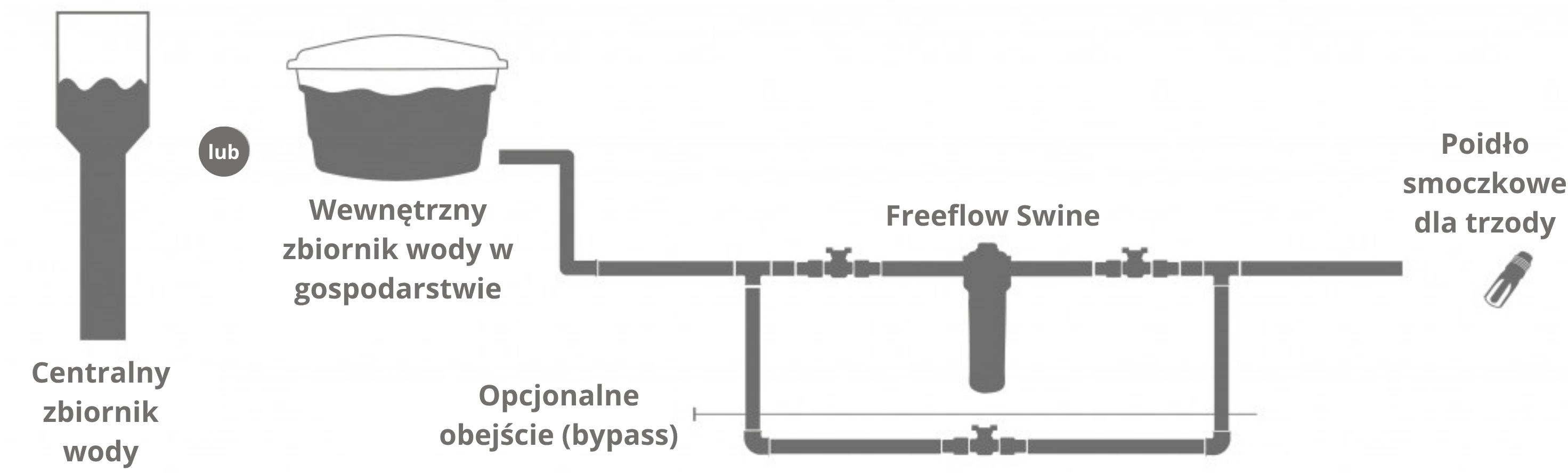 Dozownik Freeflow Swine należy zainstalować w łatwo dostępnym miejscu, pomiędzy zbiornikiem na wodę a poidłem dla zwierząt, w ilości jednego dozownika na budynek lub na maksymalnie 1200 zwierząt w okresie tuczu. Na pozostałych etapach obliczenia opierają się na dziennym zużyciu 15 000 litrów wody.