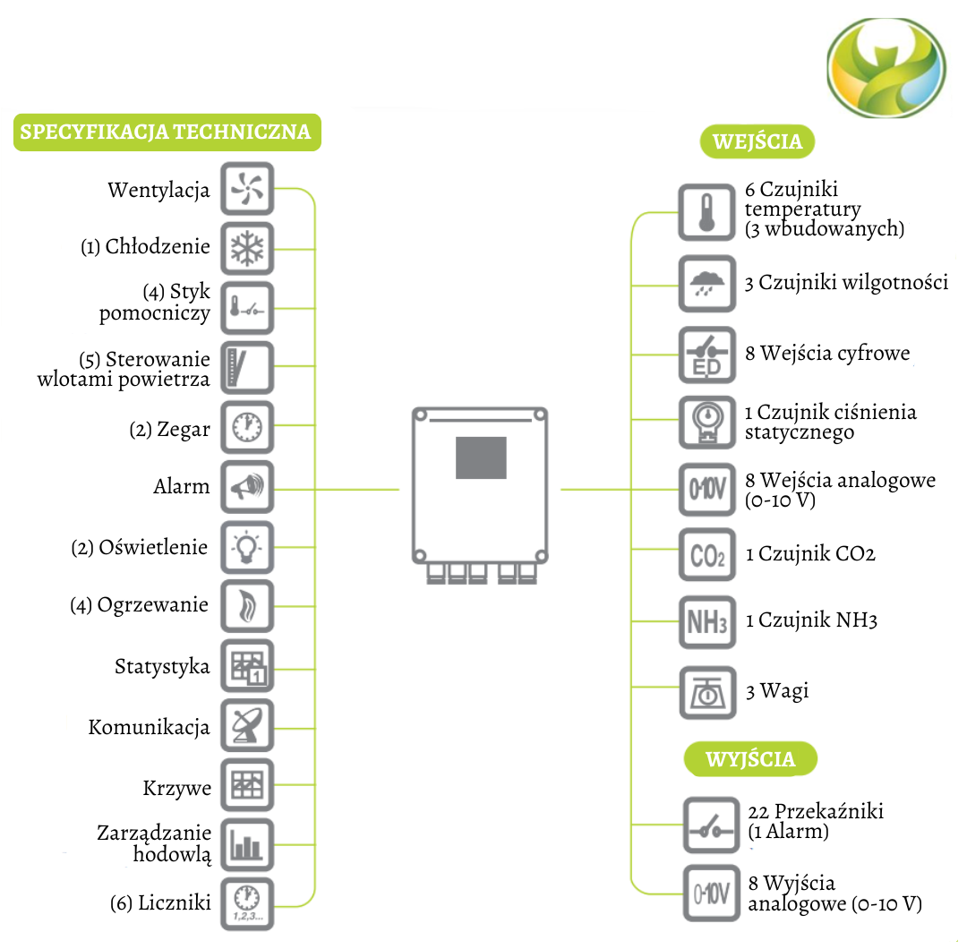 • Pozwala na sterowanie wentylacją, ogrzewaniem, chłodzeniem, alarmem, zegarami, stacją meteorologiczną, krzywymi, statystyką, licznikami, wlotami powietrza, wilgotnością, CO2, amoniakiem, ciśnieniem statycznym i zarządzaniem hodowlą i danymi pomiarów.