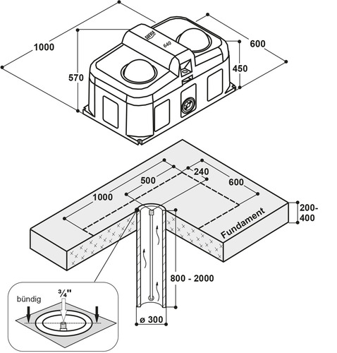 – Podłączenie do wodociągu z gwintem wewnętrznym ¾”. Wodociąg jest poprowadzony w betonowej rurze od dołu do góry do wysokości betonowego cokołu. Ciśnienie wody w wodociągu nie powinno przekraczać 5 bar.