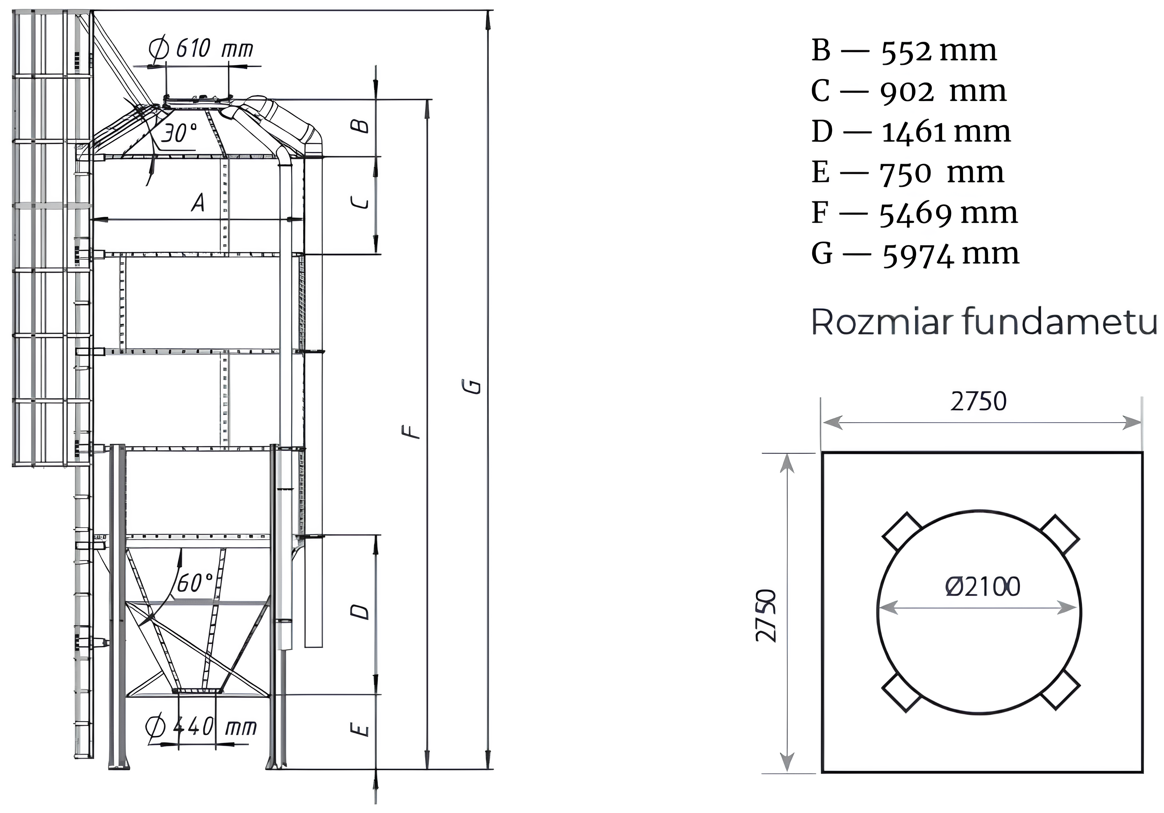 • Silos paszowy w wykonaniu standardowym jest projektowany na strefy klimatu umiarkowanego z wiatrem do 30m/s i śniegiem 1,2 kN