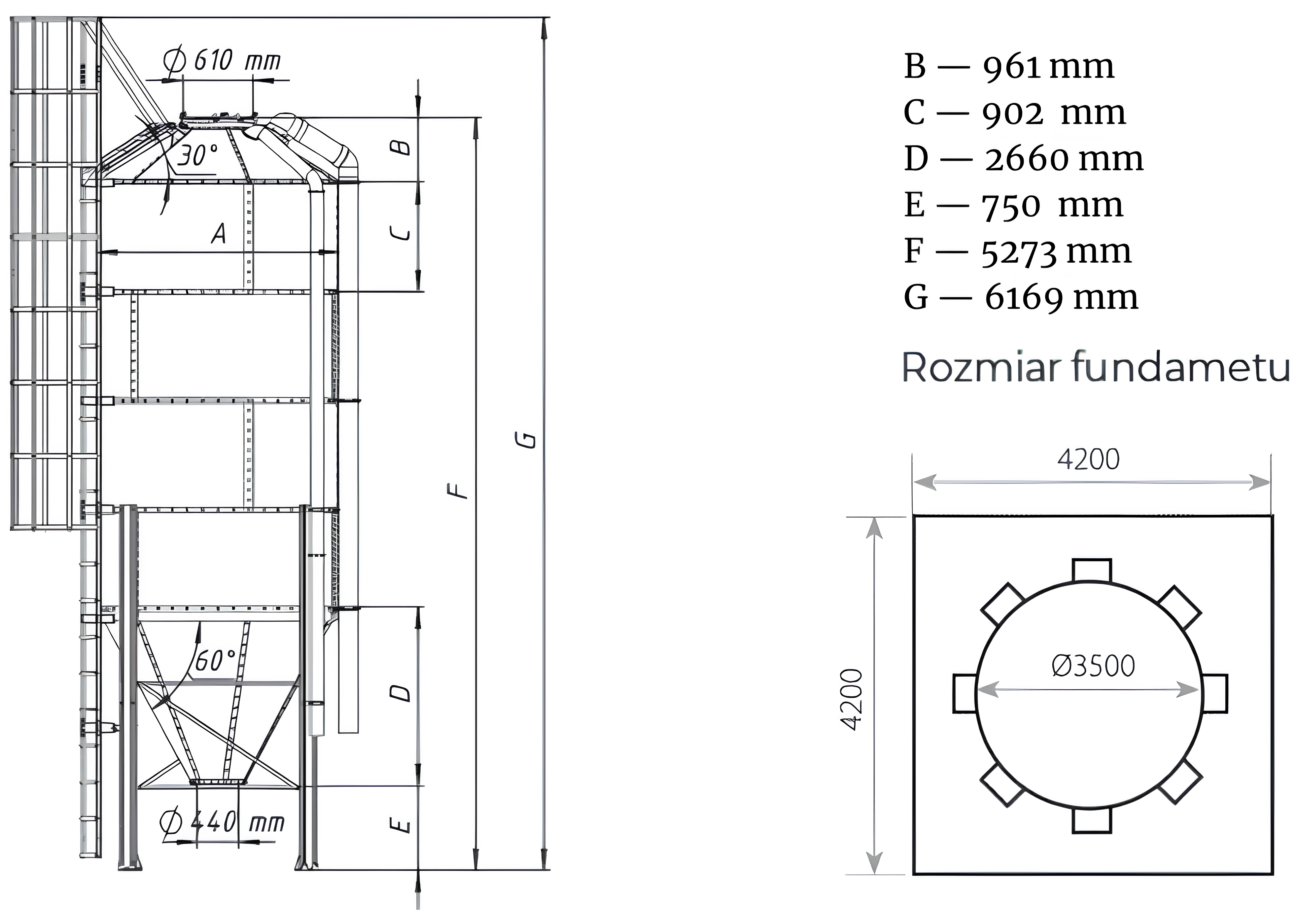 • Silos paszowy w wykonaniu standardowym jest projektowany na strefy klimatu umiarkowanego z wiatrem do 30m/s i śniegiem 1,2 kN