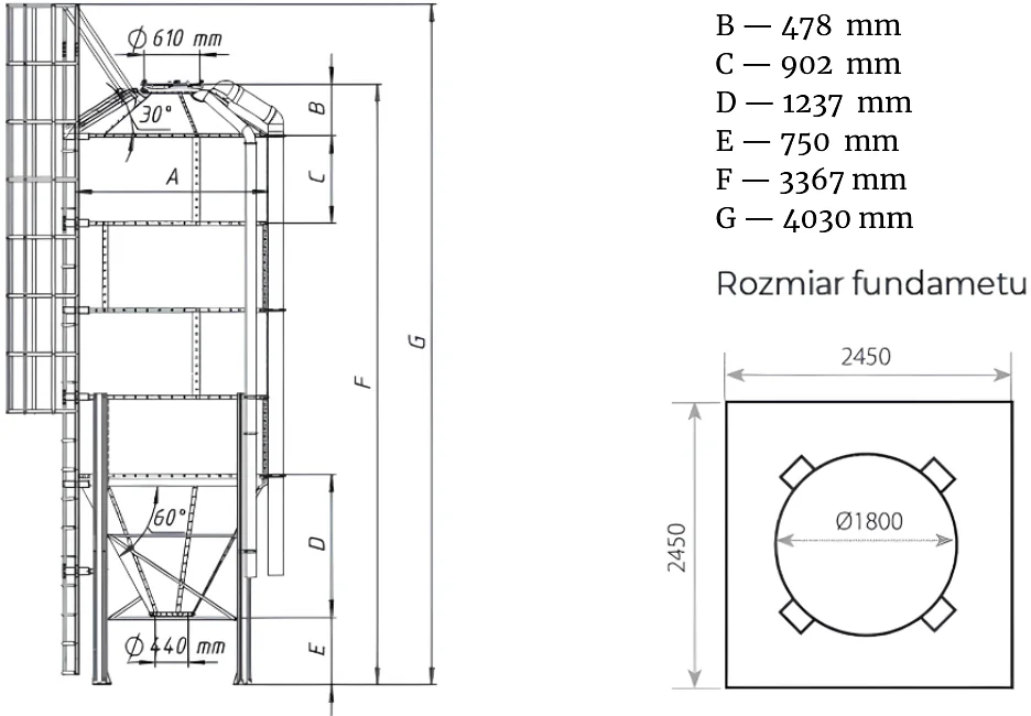 • Silos paszowy w wykonaniu standardowym przeznaczony jest do montażu na wagach tensometrycznych z grubą i sztywną górną płytą mocującą. Nie nadaje się do montażu na konstrukcjach spedycyjnych i przejazdowych, ponieważ ich konstrukcja nie przewiduje dynamicznego rozładunku grawitacyjnego.