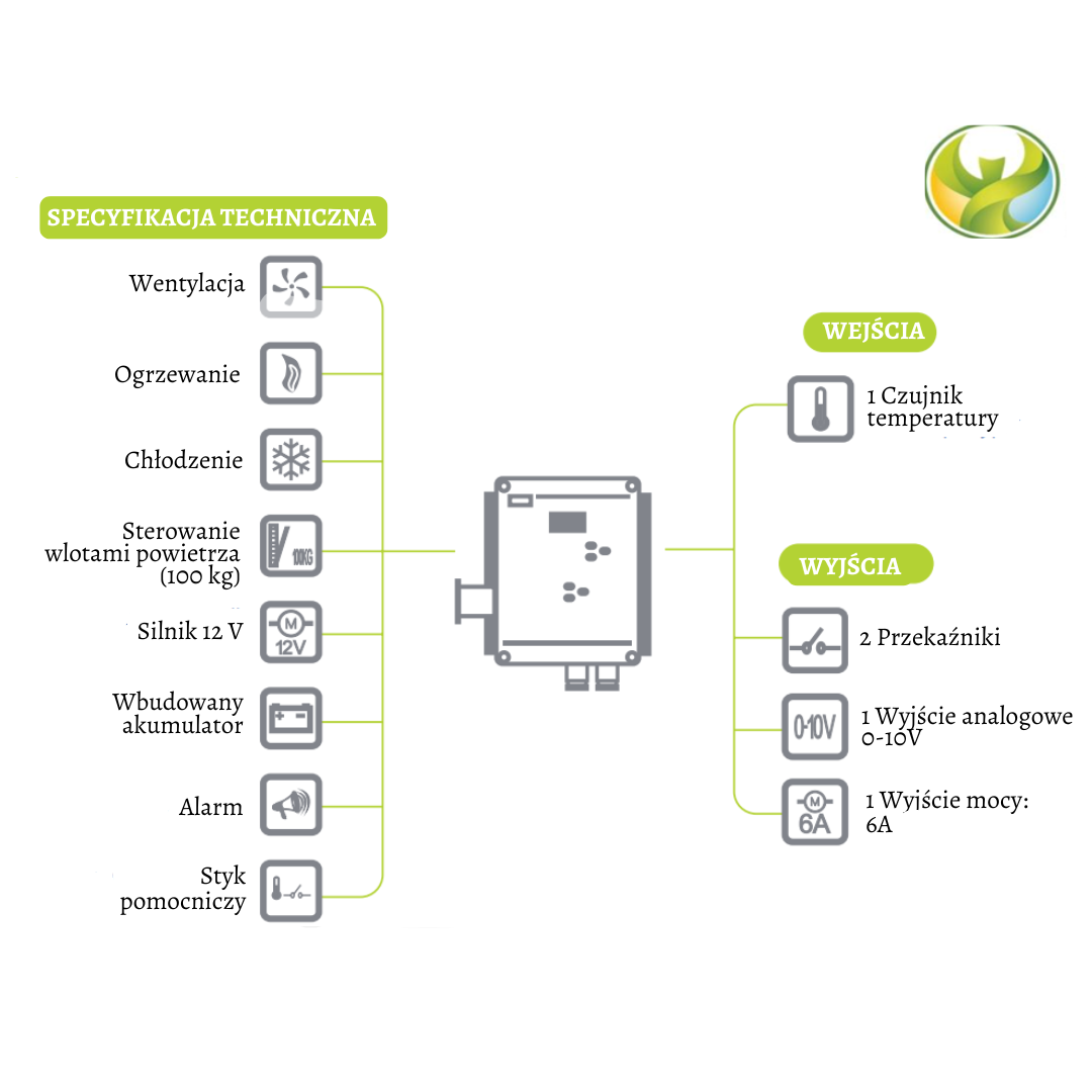 • Posiada system awaryjny i system przeciwwydechowy. W przypadku awarii zasilania elektrycznego wloty powietrza przechodzą do pozycji awaryjnej.