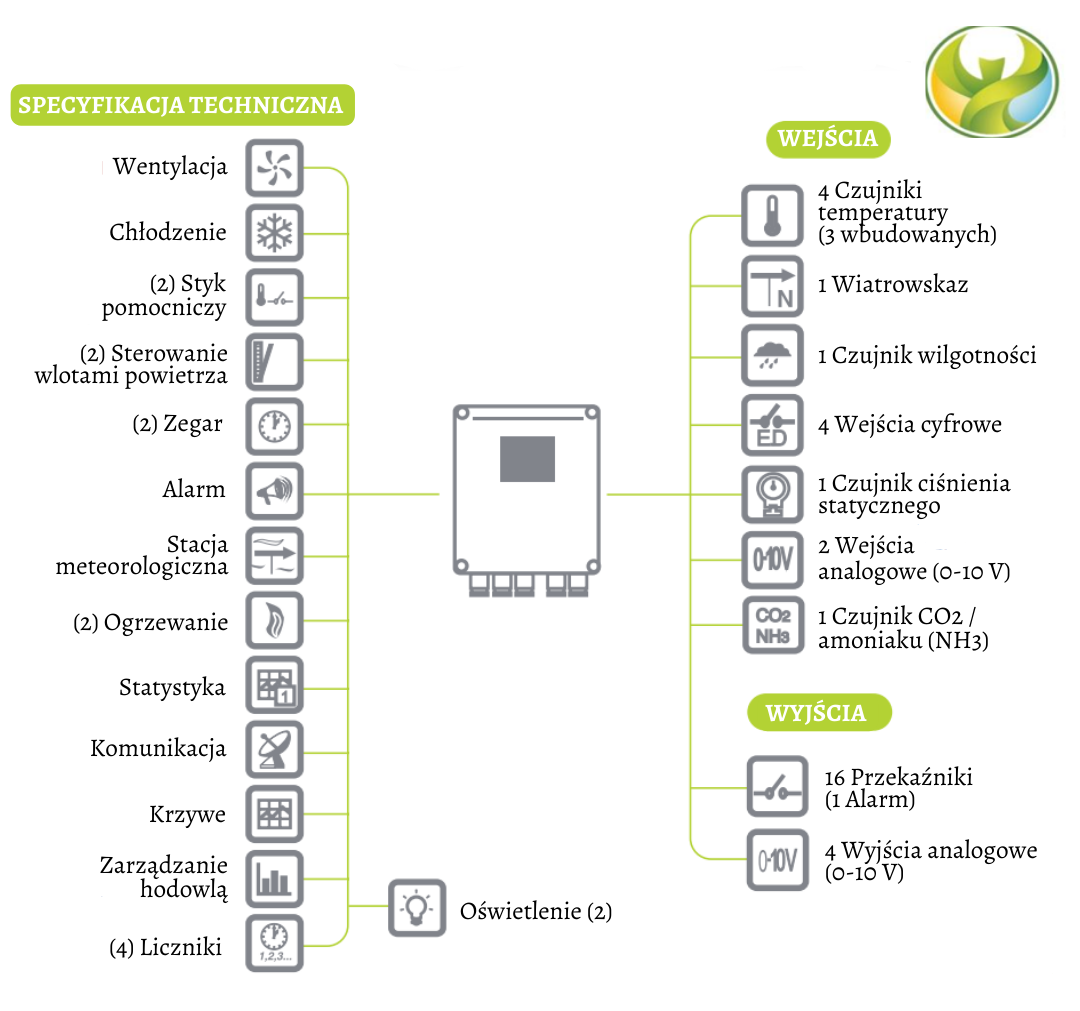 • Pozwala na sterowanie wentylacją, ogrzewaniem, chłodzeniem, alarmem, zegarami, stacją pogodową, krzywymi, licznikami, wlotami powietrza, wilgotnością, C02, amoniakiem, ciśnieniem statycznym, zarządzaniem hodowlą i 15-amperowym wyjściem triaka.