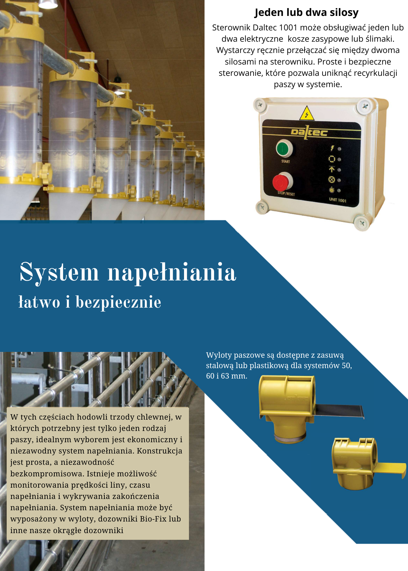 Kontroler Daltec 1001 może obsługiwać do dwóch zmotoryzowanych zasobników lub ślimaków. Przełączanie między dwoma silosami jest łatwe dzięki ręcznej obsłudze sterownika: Proste i bezpieczne – bez recyrkulacji paszy w systemie.