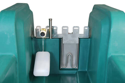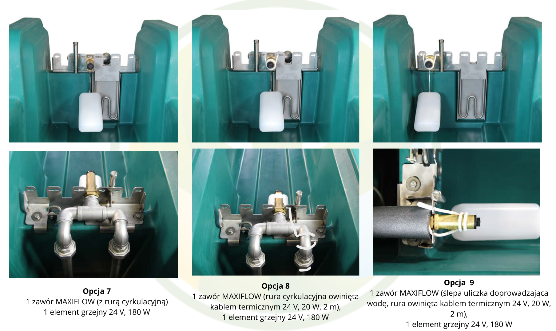 Element grzejny do montażu wewnątrz poidła Model 6069 (art. 131.6069) 24 V, 180 W. Podłączenie elektryczne poprzez transformator obniżający napięcie 230/24 V. W celu ochrony przed zamarzaniem ślepych rur wodociągowych, są one owinięte kablem grzewczym 24 V: długość 2 m (20 W, nr art. 101.0861) lub 3 m (30 W, nr art. 101.0863). Kabel grzewczy jest podłączony do elementu grzejnego równolegle z przewodami zasilania napięciem z transformatora.