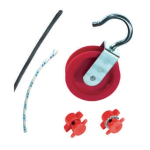 Zestaw do podwieszania linii pojenia: koło pasowe, lina stalowa, sznur oraz zaciski