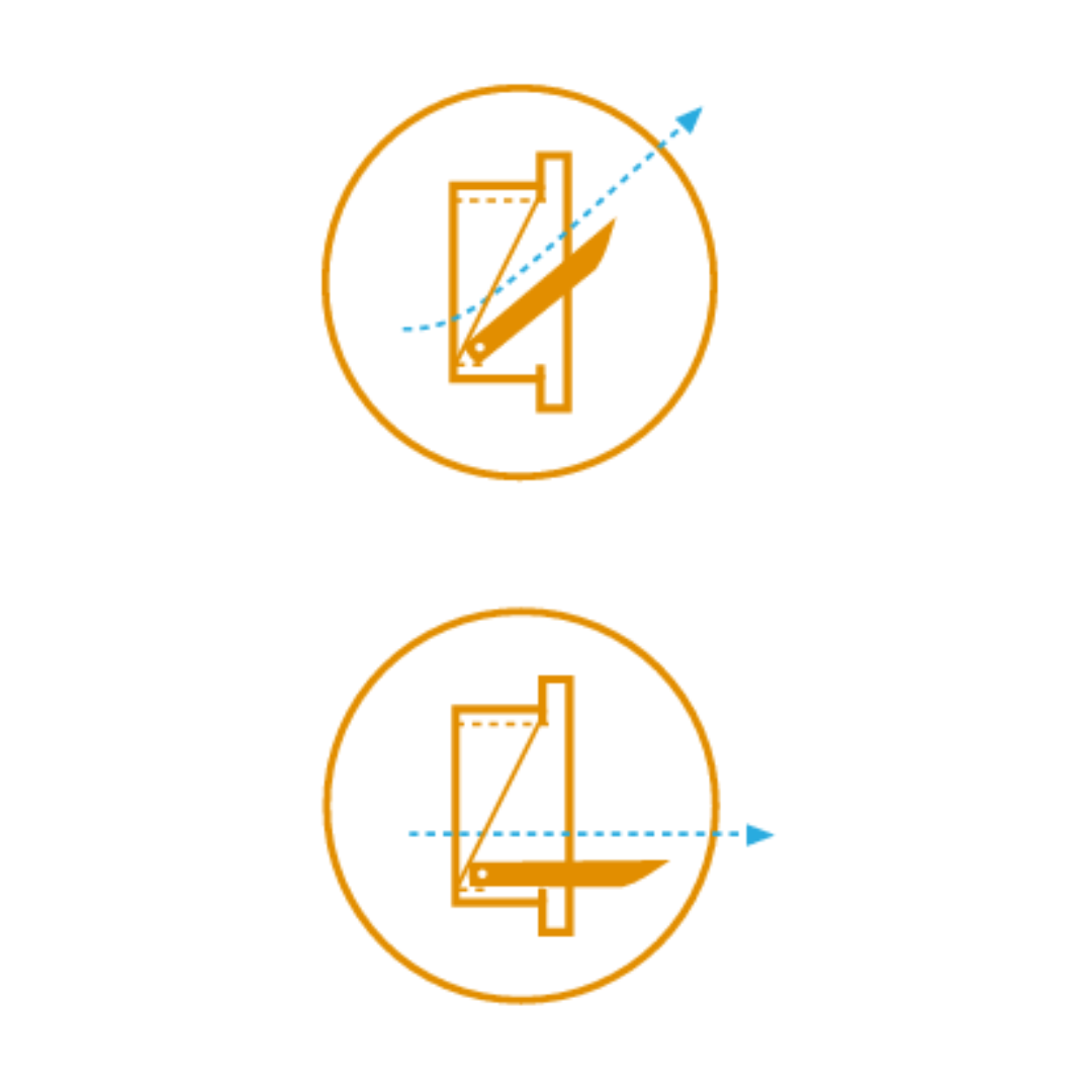Prosta klapa wewnętrzna. Wlot jest wyposażony w prostą klapę wewnętrzną. Proste klapy kierują powietrze prosto w górę lub poziomo, nigdy w dół. Jest to idealne rozwiązanie dla pomieszczeń, w których podczas maksymalnej wentylacji powietrze nie powinno być kierowane bezpośrednio na zwierzęta lub nad nimi.