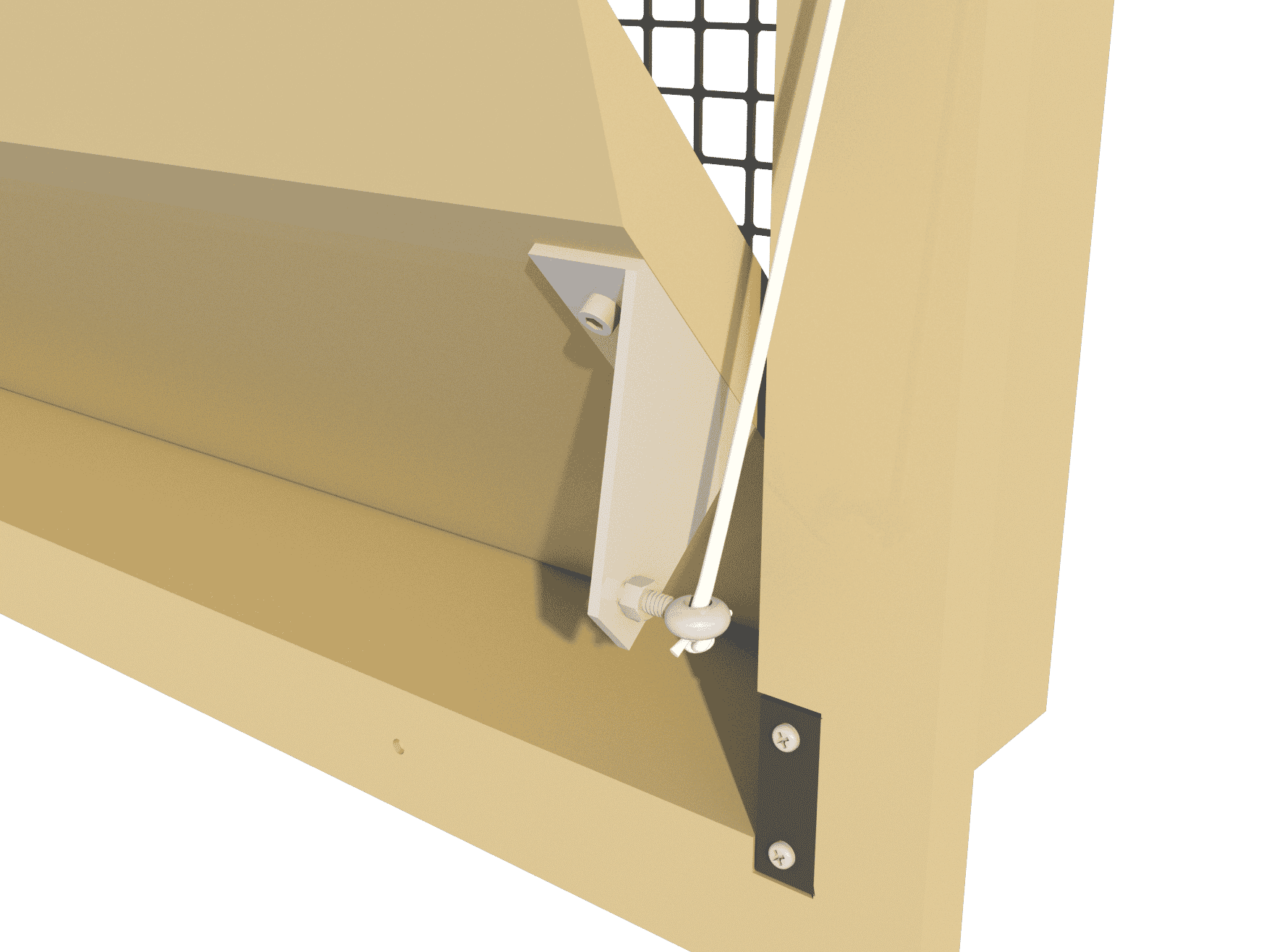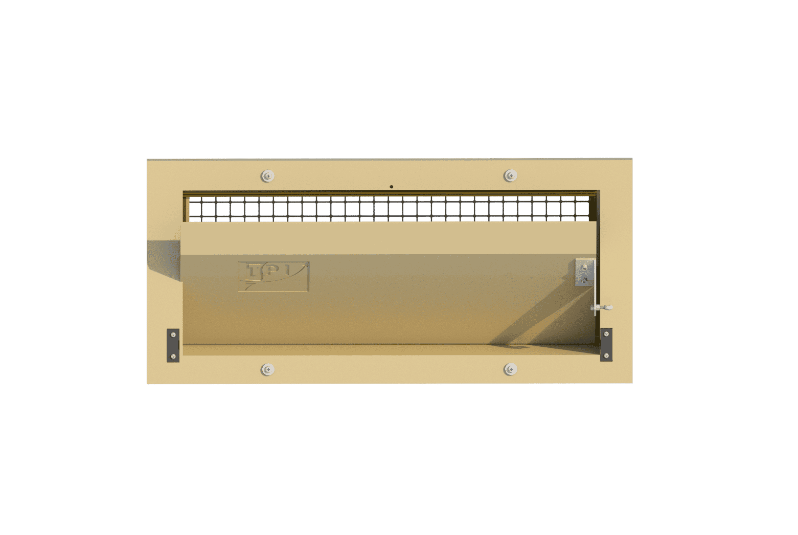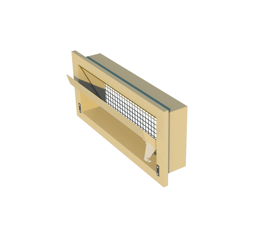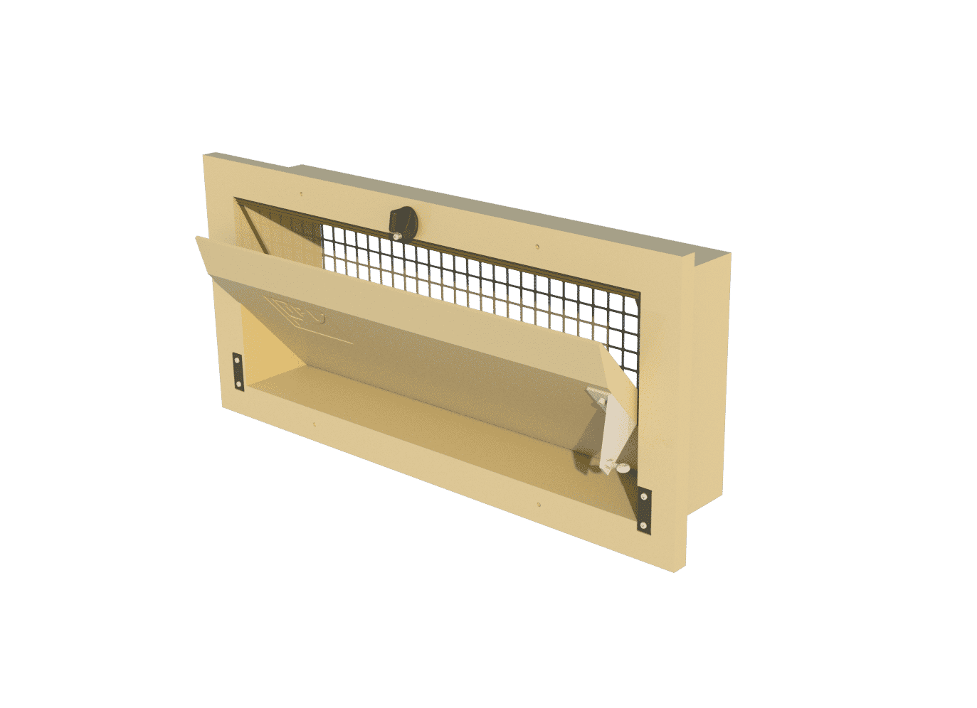 Wlot z dolnym zawiasem. Ten wlot służy do kierowania powietrza przez wewnętrzną klapę w górę do wnętrza budynku. Doskonale nadaje się do chłodniejszych klimatów, gdzie powietrze nie powinno być kierowane w stronę zwierząt, nawet podczas maksymalnej wentylacji.