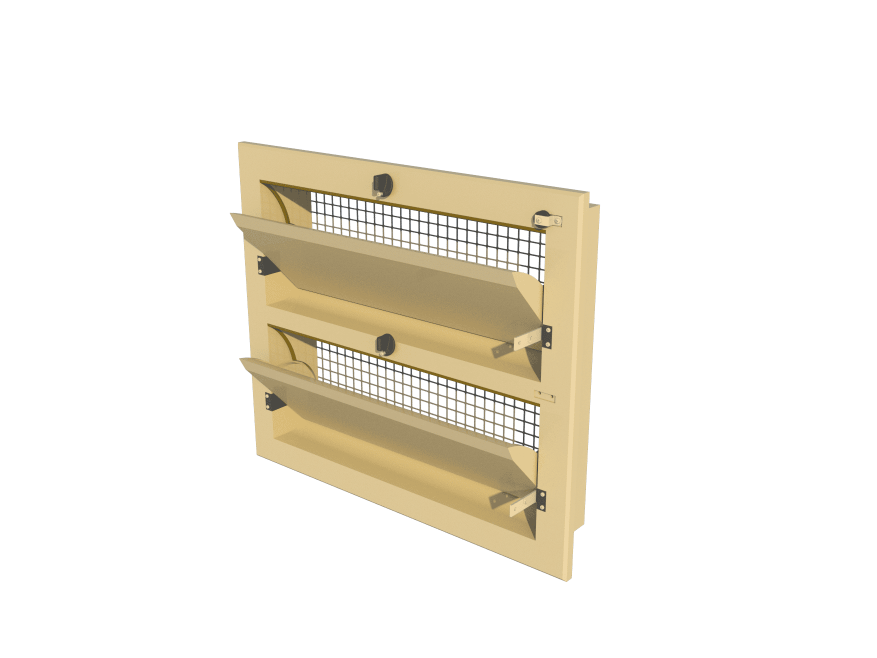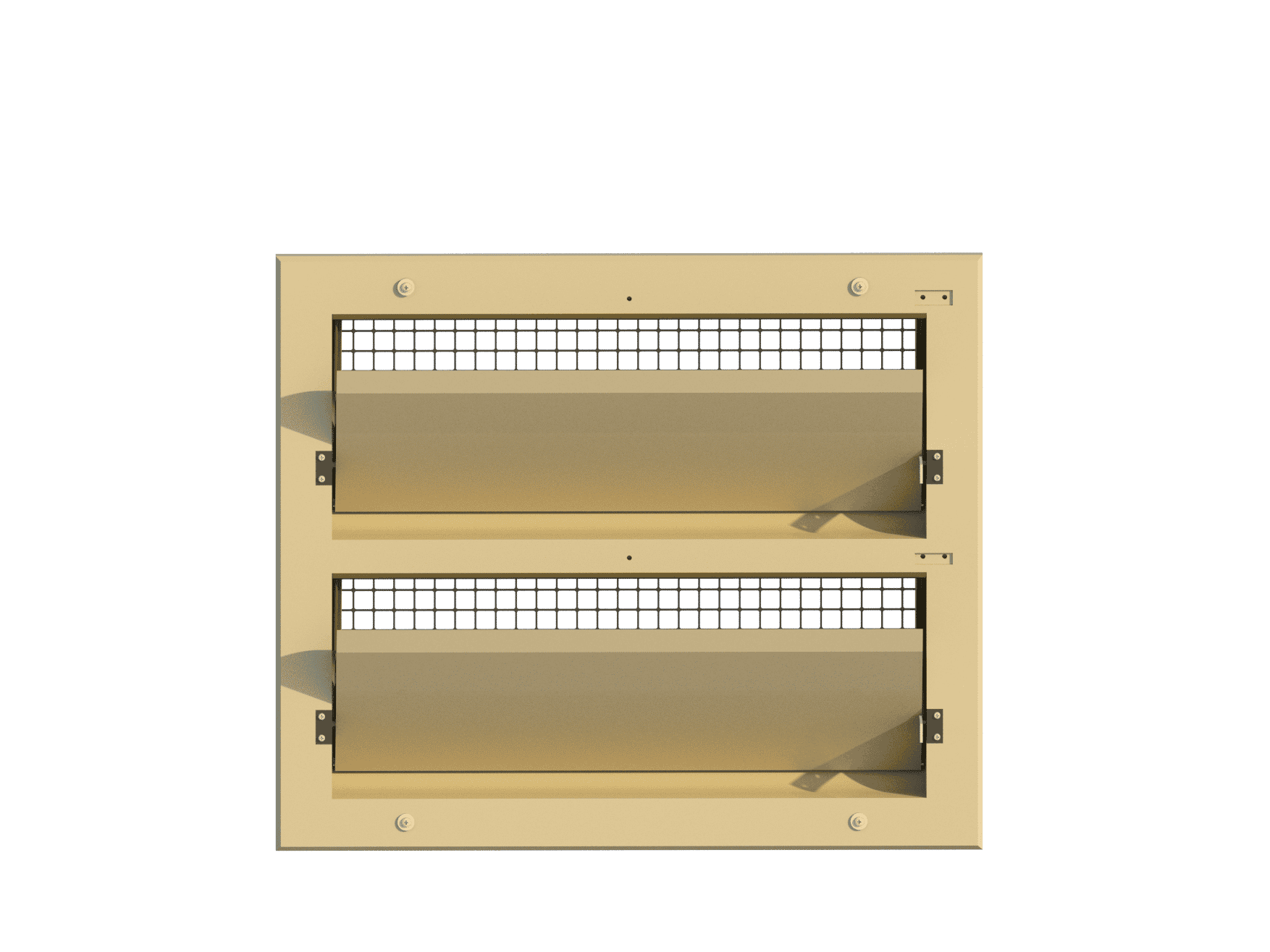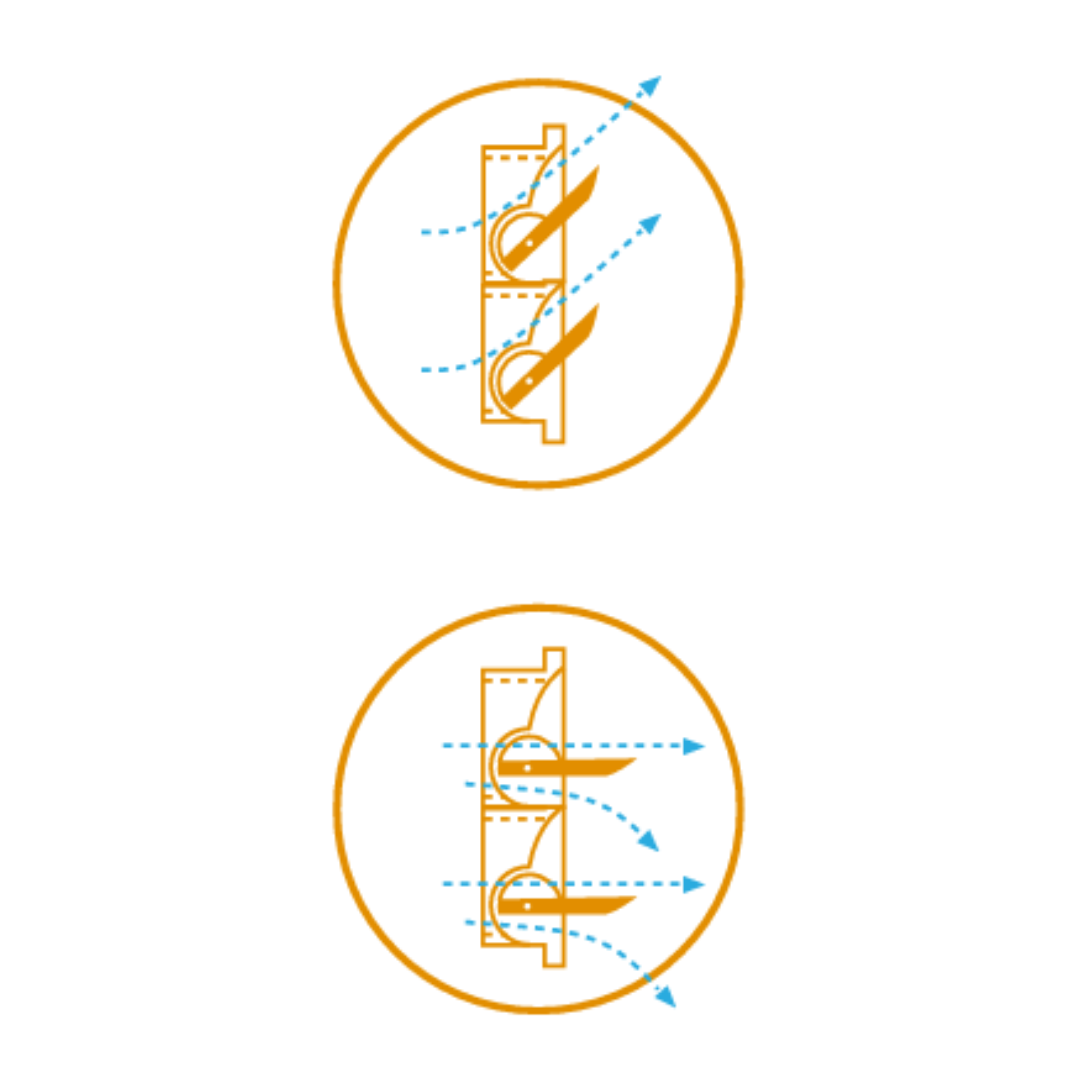 Prosta klapa wewnętrzna. Wlot jest wyposażony w prostą klapę wewnętrzną. Proste klapy kierują powietrze prosto w górę lub poziomo, nigdy w dół. Jest to idealne rozwiązanie dla pomieszczeń, w których podczas maksymalnej wentylacji powietrze nie powinno być kierowane bezpośrednio na zwierzęta lub nad nimi.