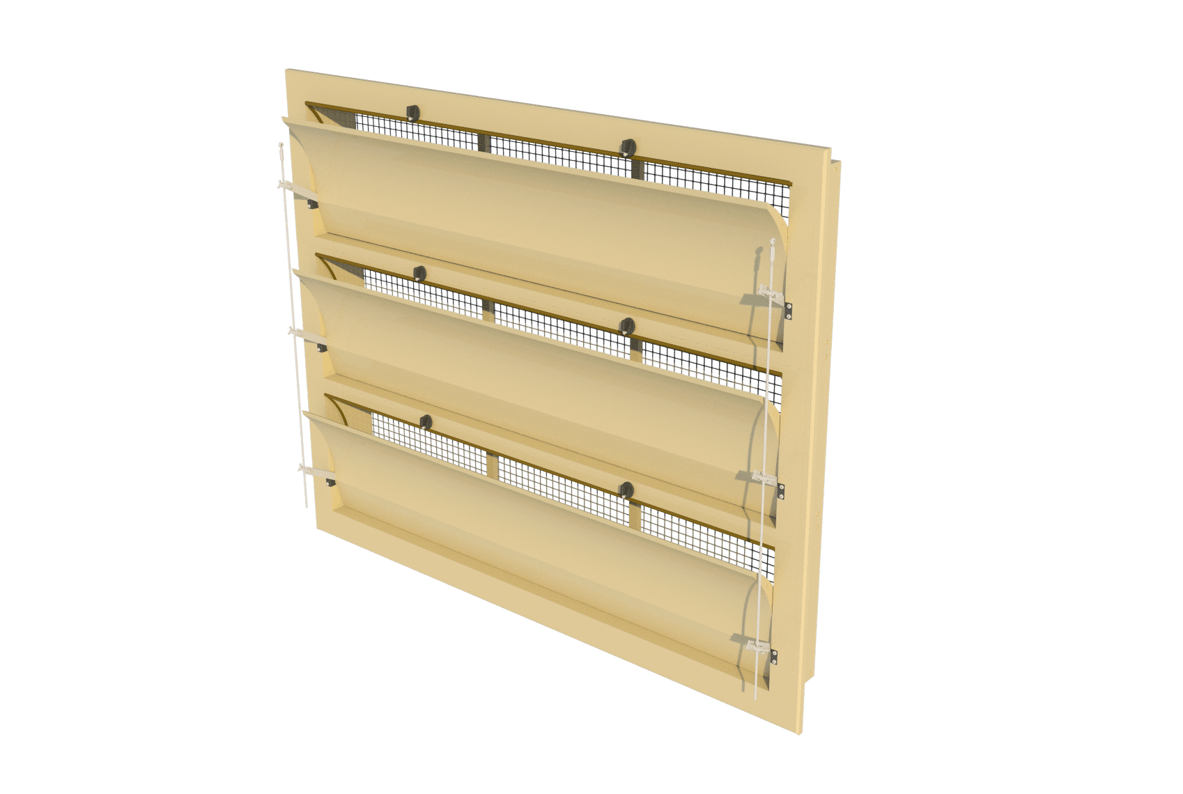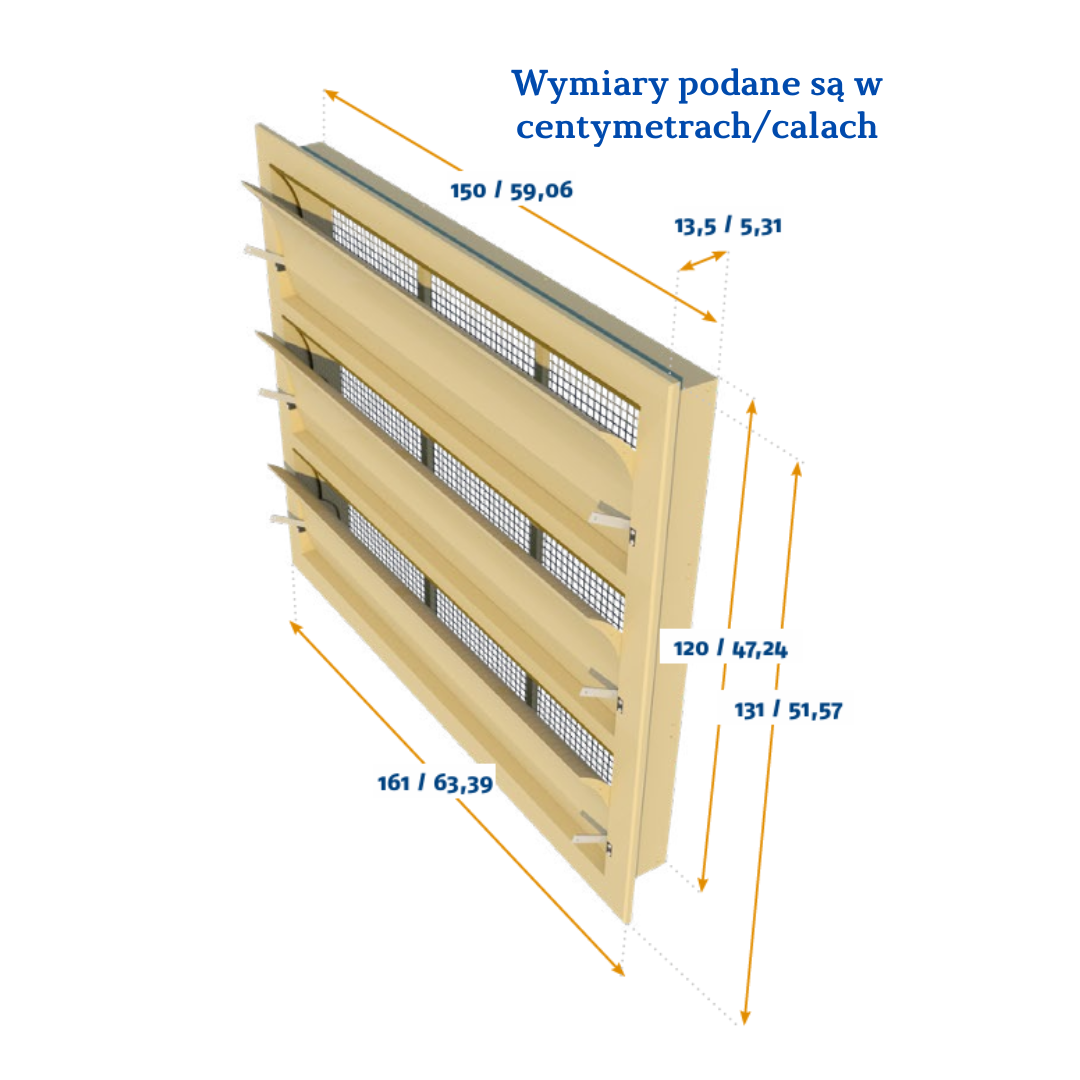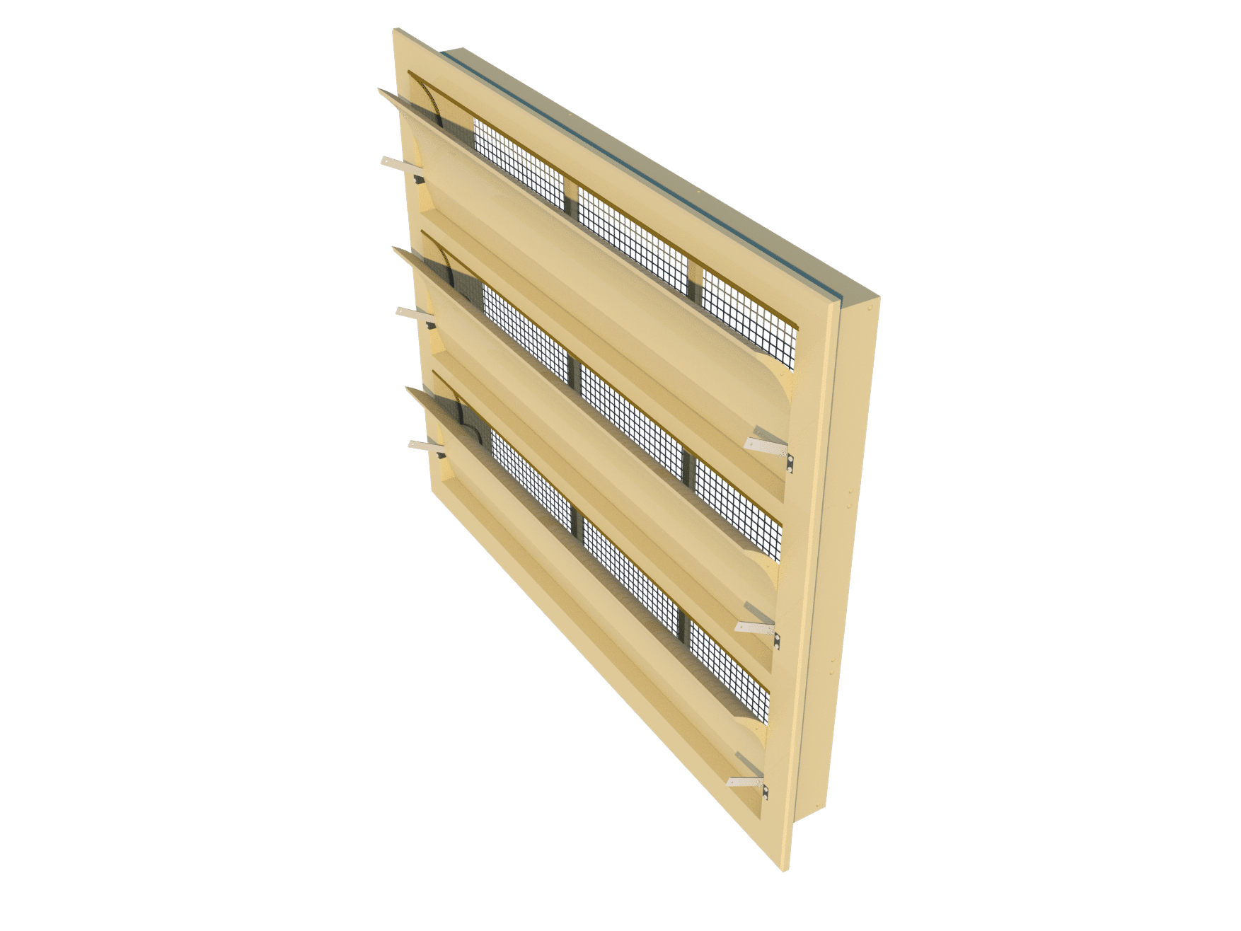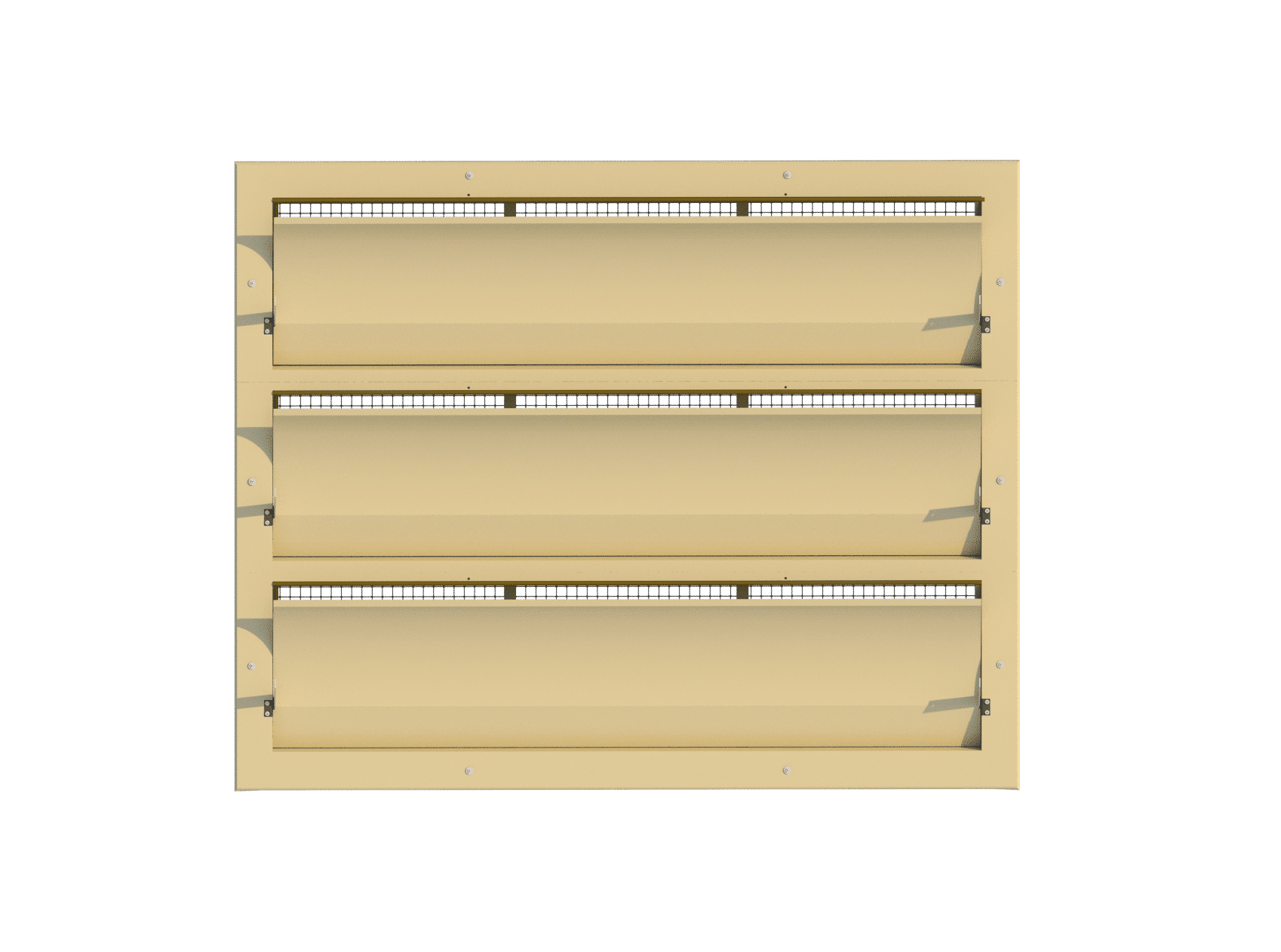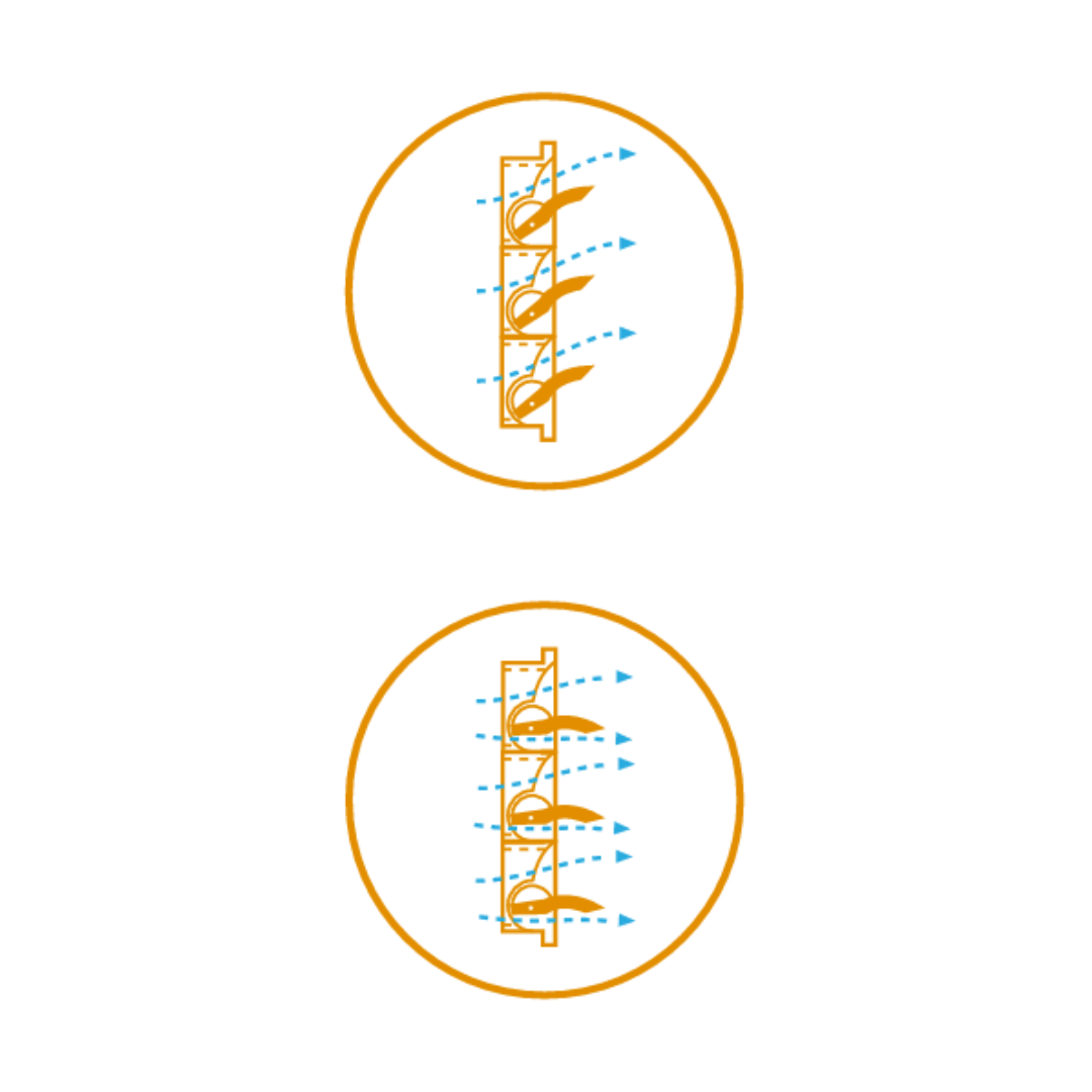 Zakrzywiona wewnętrzna klapa. Ten wlot wyposażony jest w zakrzywioną wewnętrzną klapę. Zakrzywione klapy kierują powietrze w górę podczas minimalnej wentylacji, a po osiągnięciu określonego stopnia otwarcia – również w dół. Jest to idealne rozwiązanie dla budynków, w których powietrze powinno być kierowane bezpośrednio na zwierzęta lub nad nimi podczas maksymalnej wentylacji.