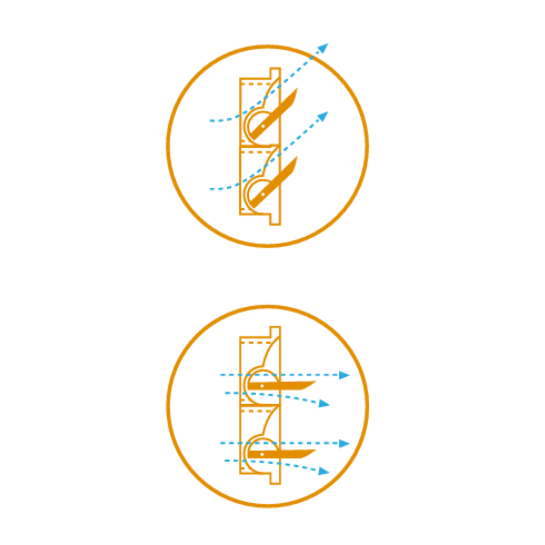 Prosta klapa wewnętrzna. Wlot jest wyposażony w prostą klapę wewnętrzną. Proste klapy kierują powietrze prosto w górę lub poziomo, nigdy w dół. Jest to idealne rozwiązanie dla pomieszczeń, w których podczas maksymalnej wentylacji powietrze nie powinno być kierowane bezpośrednio na zwierzęta lub nad nimi.