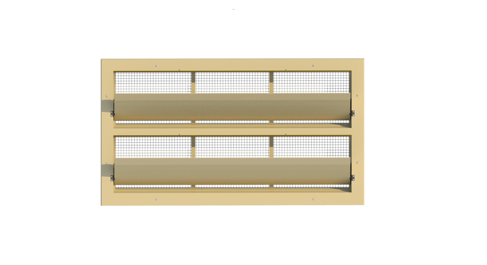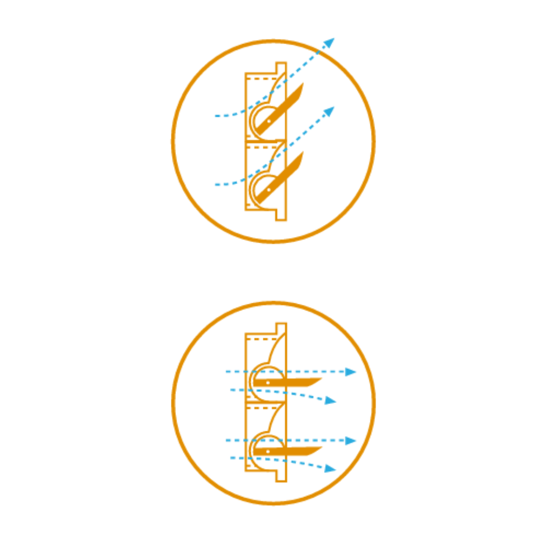 Prosta klapa wewnętrzna. Wlot jest wyposażony w prostą klapę wewnętrzną. Proste klapy kierują powietrze prosto w górę lub poziomo, nigdy w dół. Jest to idealne rozwiązanie dla pomieszczeń, w których podczas maksymalnej wentylacji powietrze nie powinno być kierowane bezpośrednio na zwierzęta lub nad nimi.