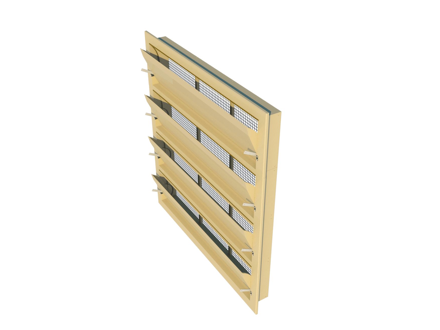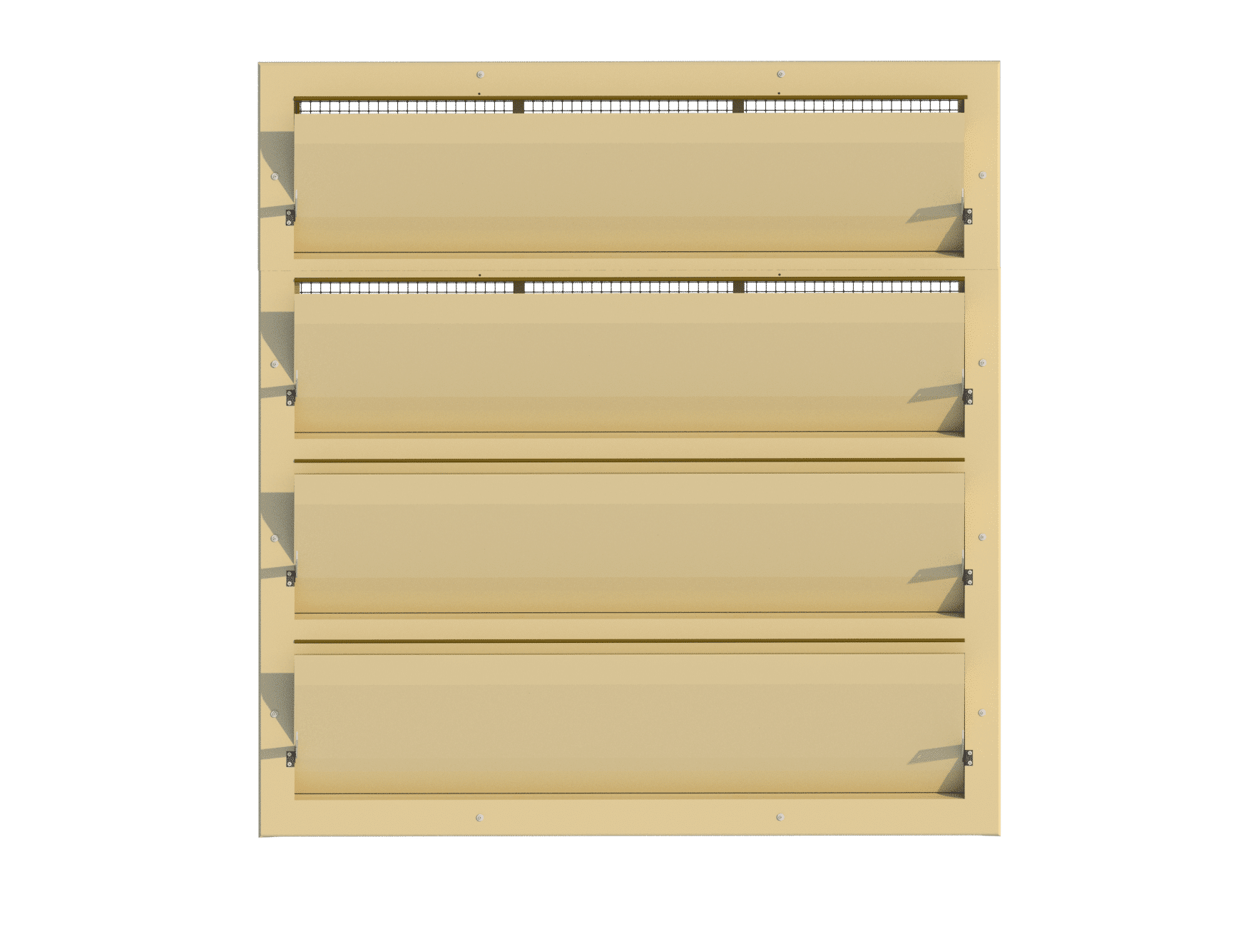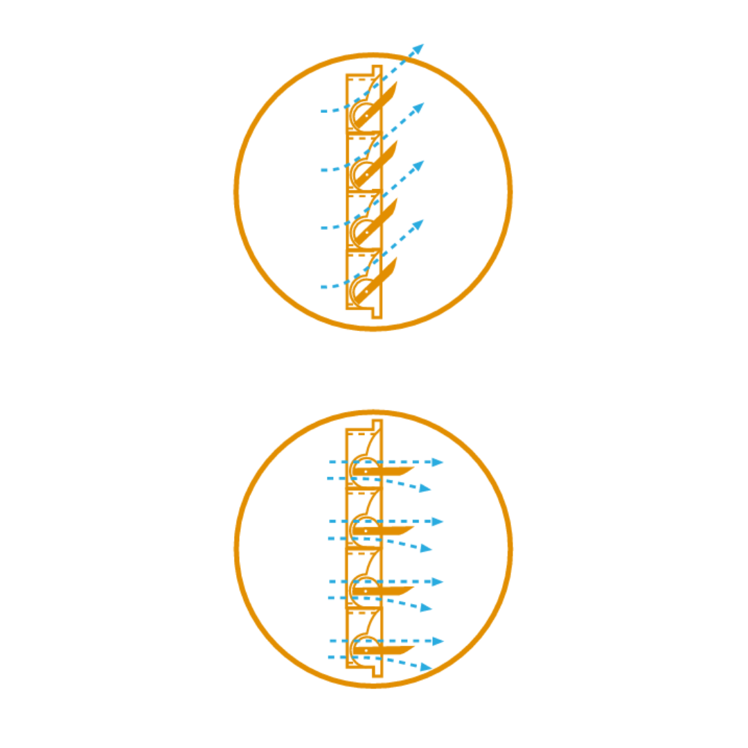 Prosta klapa wewnętrzna. Wlot jest wyposażony w prostą klapę wewnętrzną. Proste klapy kierują powietrze prosto w górę lub poziomo, nigdy w dół. Jest to idealne rozwiązanie dla pomieszczeń, w których podczas maksymalnej wentylacji powietrze nie powinno być kierowane bezpośrednio na zwierzęta lub nad nimi.