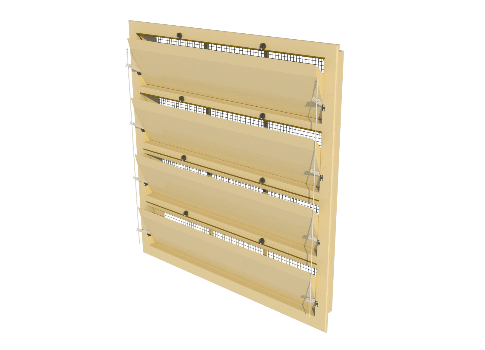 Wlot ze środkowym zawiasem. Ten wlot ze środkowym zawiasem został zaprojektowany tak, aby po otwarciu powyżej 35% umożliwić przepływ powietrza również pod wewnętrzną klapą. Dzięki temu strumień powietrza może być kierowany w dół, w stronę zwierząt, zapewniając efekt chłodzenia podczas maksymalnej wentylacji.