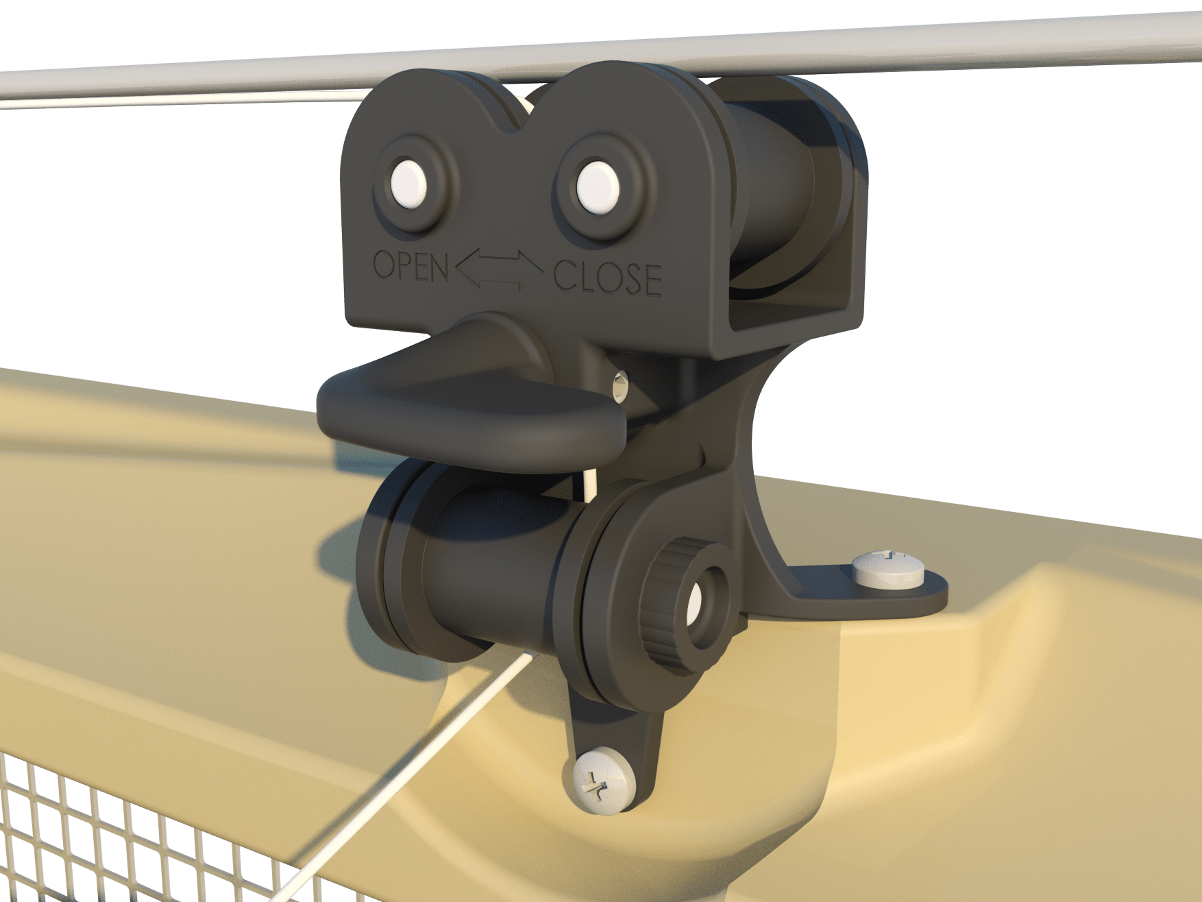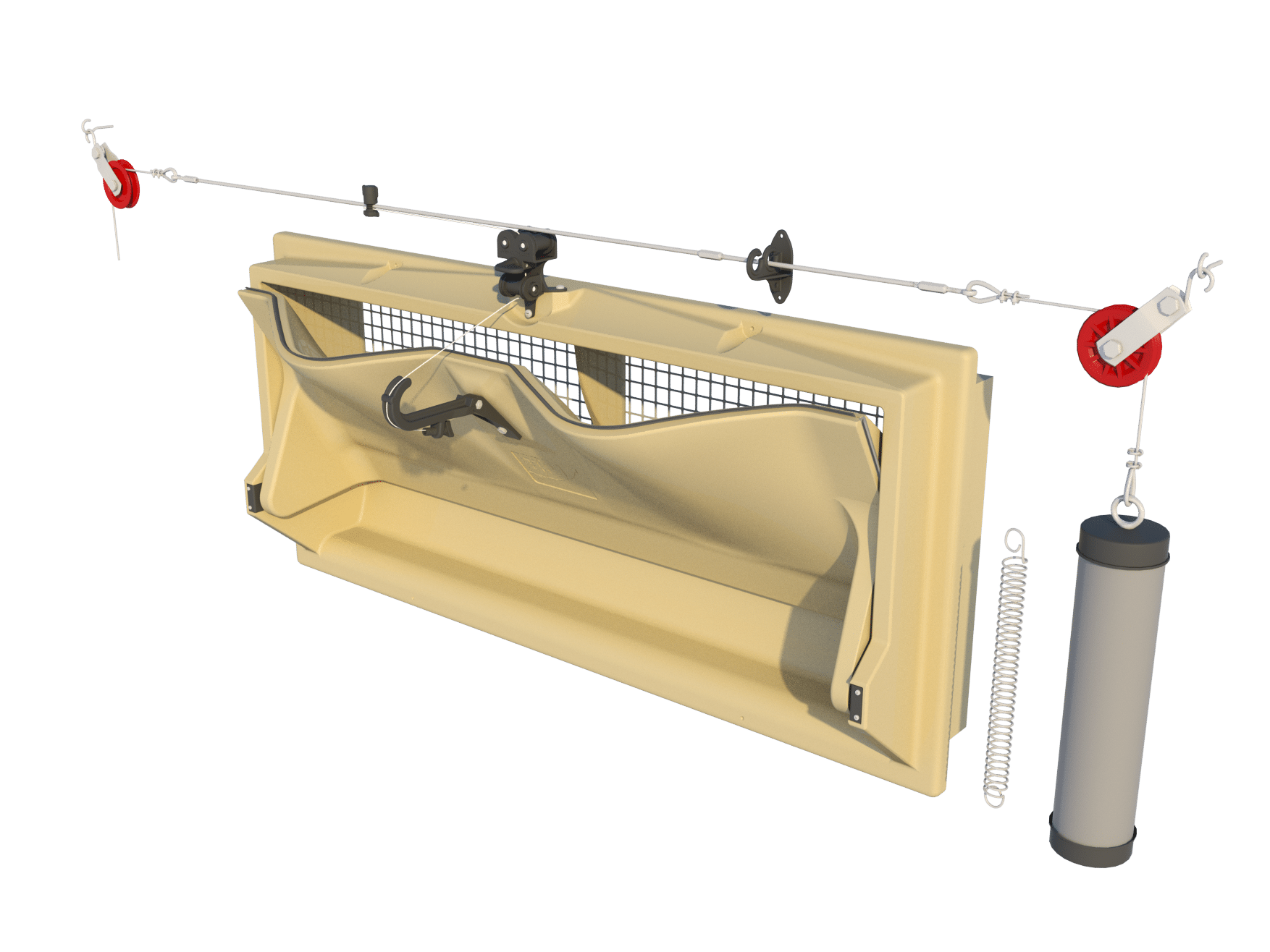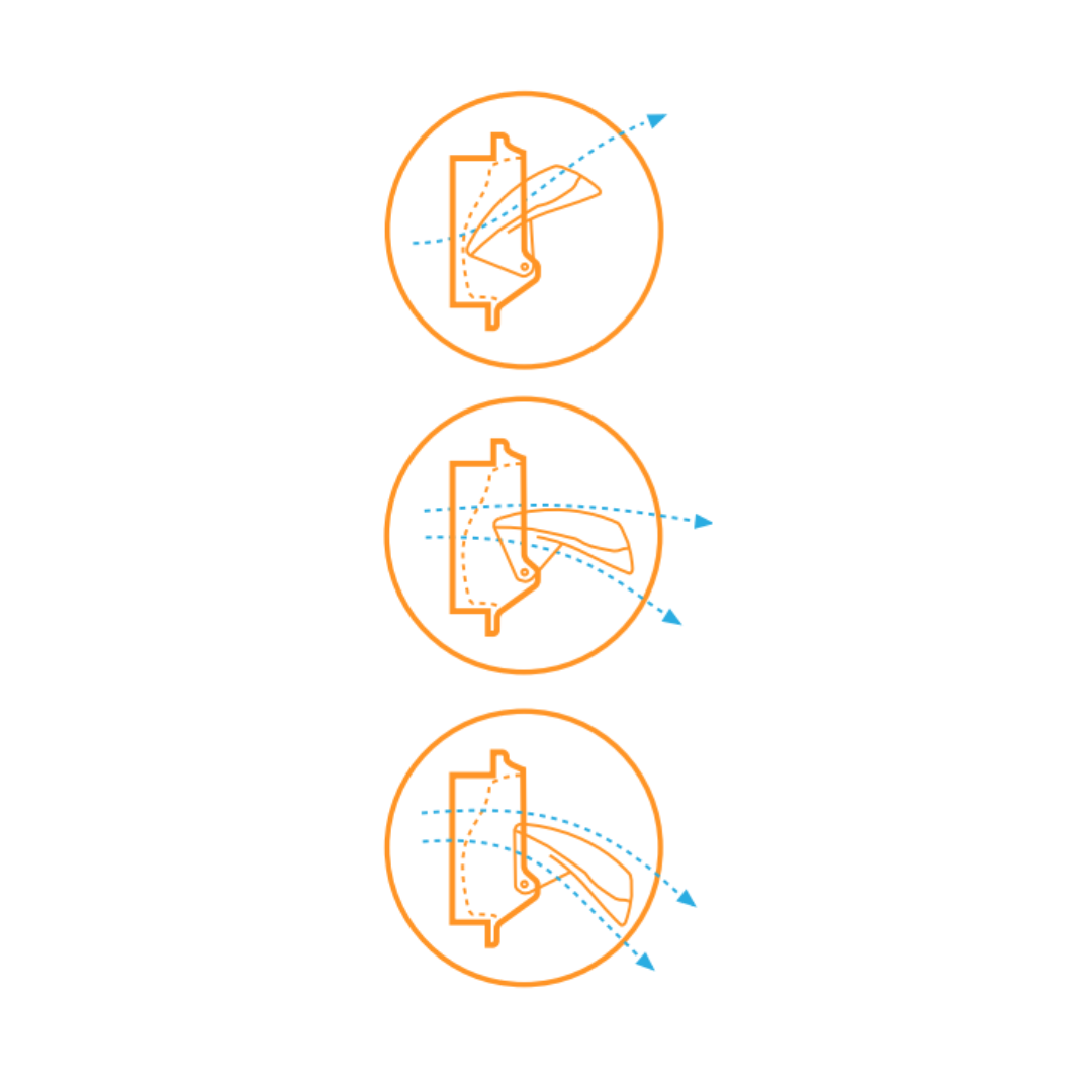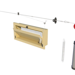 Samozamykające się wloty i opóźnione otwieranie. Znaczna część naszego asortymentu może być również produkowana jako samozamykające się wloty powietrza. W takim przypadku mechanizm otwierania i zamykania działa w odwrotny sposób. Bloczki wiszące muszą być zamontowane na dolnym kołnierzu, a centralne plastikowe ramię sterujące powinno prowadzić linkę nylonową w dół. Główna linka musi być zamontowana pod wlotami. Przy takim układzie można stworzyć system opóźnionego otwierania, co oznacza, że poprzez regulację kąta centralnego ramienia sterującego można określić, jak wcześnie lub późno otworzy się dany wlot w porównaniu do innych na tej samej linii.